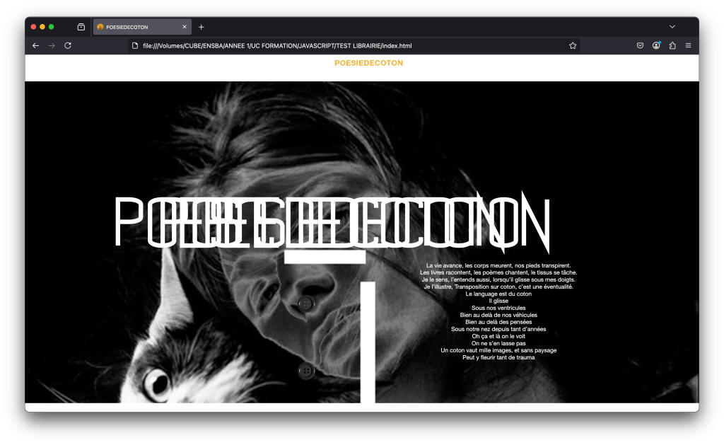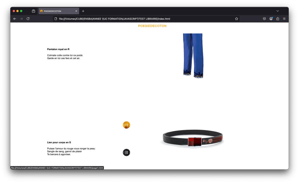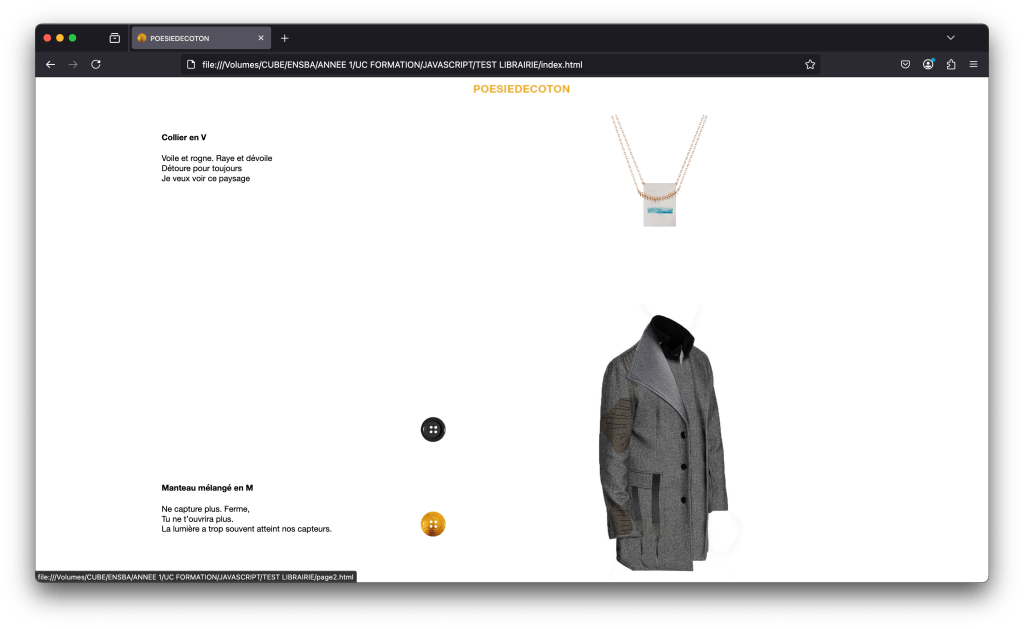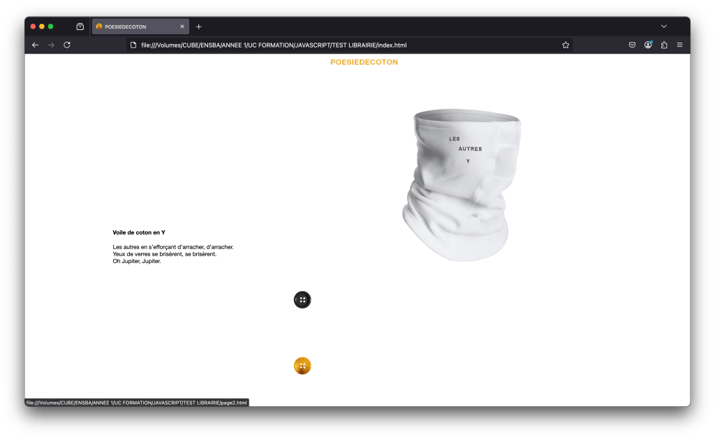 développé entre 2018 et 2019 poesiedecoton est un vrai/faux site web interactif d’une fausse boutique en ligne de vêtement poétique de luxe. Chaque article est associé à une poésie. Il n’est actuellement plus hébergé, en voici néanmoins un court témoignage.