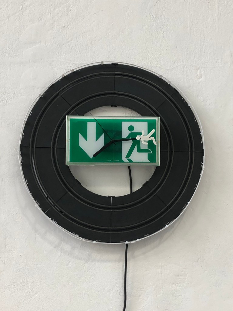 exit reprend la forme et le fonctionnement d’une horloge. En forme de circuit de voiture miniature, une icône de personnage court en cercle sans ne jamais trouver la sortie de secours. À l’image de notre société et de l’urgence climatique qui avance je cherche une sortie inexistante.