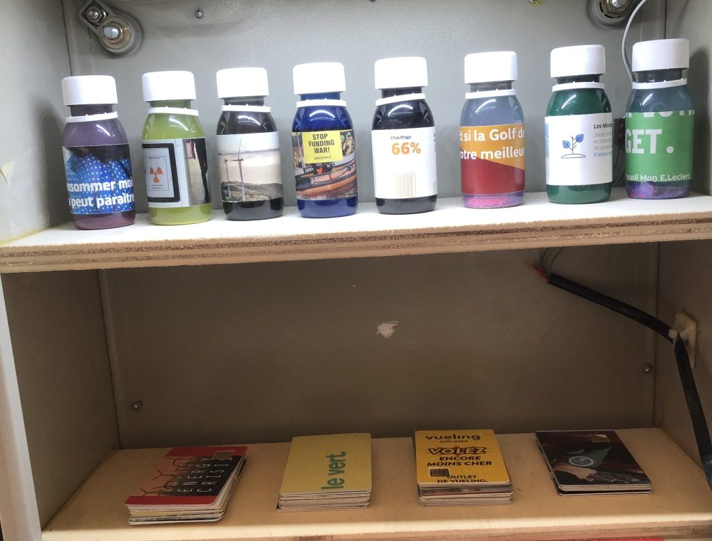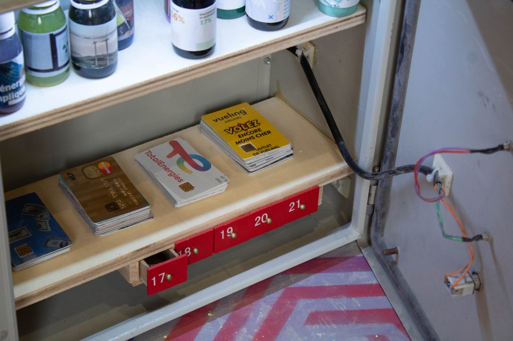 CB, sculpture constitué d’éléments de récupération, publicité et de fausse carte bleu, 2023