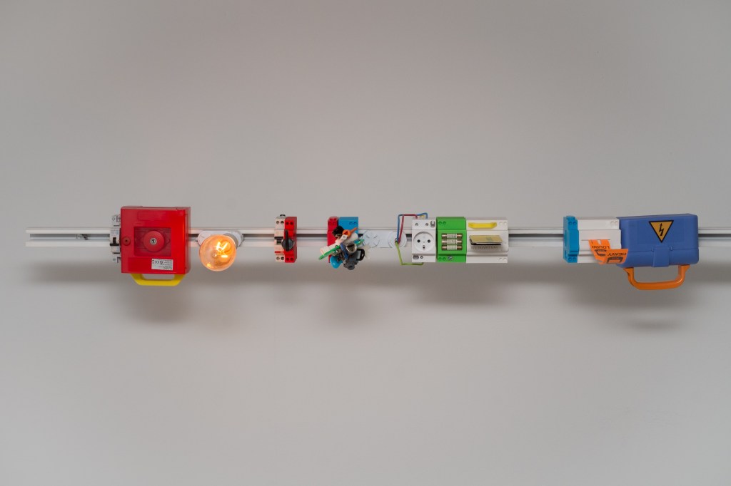Cette sculpture s’attache à révéler ce qui court derrière nos murs, et qui permet la circulation de l’électricité. C’est un segment électrique qui vient se brancher sur les rails d’éclairage normés dans les espaces d’exposition et accueillant du public (magasin, galeries, …). Censé être le moins visible et le plus pratique possible, celui-ci impose néanmoins des contraintes et des ajustements entraînant une sorte de négociation dans une quête de liberté contrainte par un cadre. Dans ce mélange entre vrai et faux, éléments originels ou copies imprimées en 3D, brille une vieille ampoule à filament. Par ce principe d’aller-retour entre les ressorts normatifs des systèmes électriques et du système social, cette œuvre s’insère dans une réflexion sur la maintenance, sur sa tension entre visibilité et invisibilité.