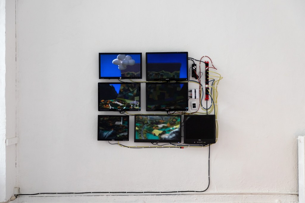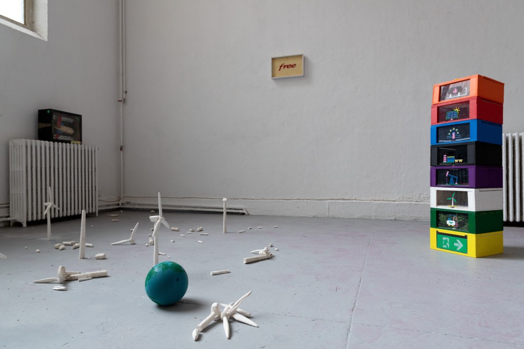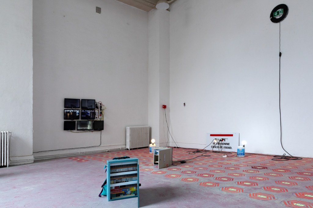 À travers un projet vidéo et sonore déployé sur sept écrans, Pierlouis Clavel donne vie à un personnage empreint d’anxiété et de mélancolie. En incarnant cet alter-ego, il cristallise ses préoccupations sur la société contemporaine et les flux énergétiques qui la parcourent. Des éléments publicitaires, tels que des slogans et des noms de marques, mettent en évidence l’absurdité de notre asservissement à la consommation. En interrogeant notre rapport au temps et à la productivité, son travail représente une clé symbolique pour se libérer de cette dépendance. Il utilise des codes visuels exprimant l’urgence, établissant une analogie entre les mécanismes organisationnels de l’industrie et notre conception de la liberté. Il s’appuie sur une étude quantifiant les énergies produites annuellement par notre planète pour questionner le rôle de la transition écologique qui tend à accumuler les énergies au lieu de les substituer. Les prétendues nouvelles technologies sont récupérées, un procédé qu’il applique dans la construction de ses sculptures où les éléments industriels assemblés ont certainement été réparés. Parmi elles, un satellite semblant s’être écrasé symbolise l’échec de sa mission potentiellement salvatrice pour l’humanité. Explorant les conséquences de notre avidité énergétique, l’œuvre de Pierlouis Clavel suscite une prise de conscience de l’impact humain sur l’environnement.