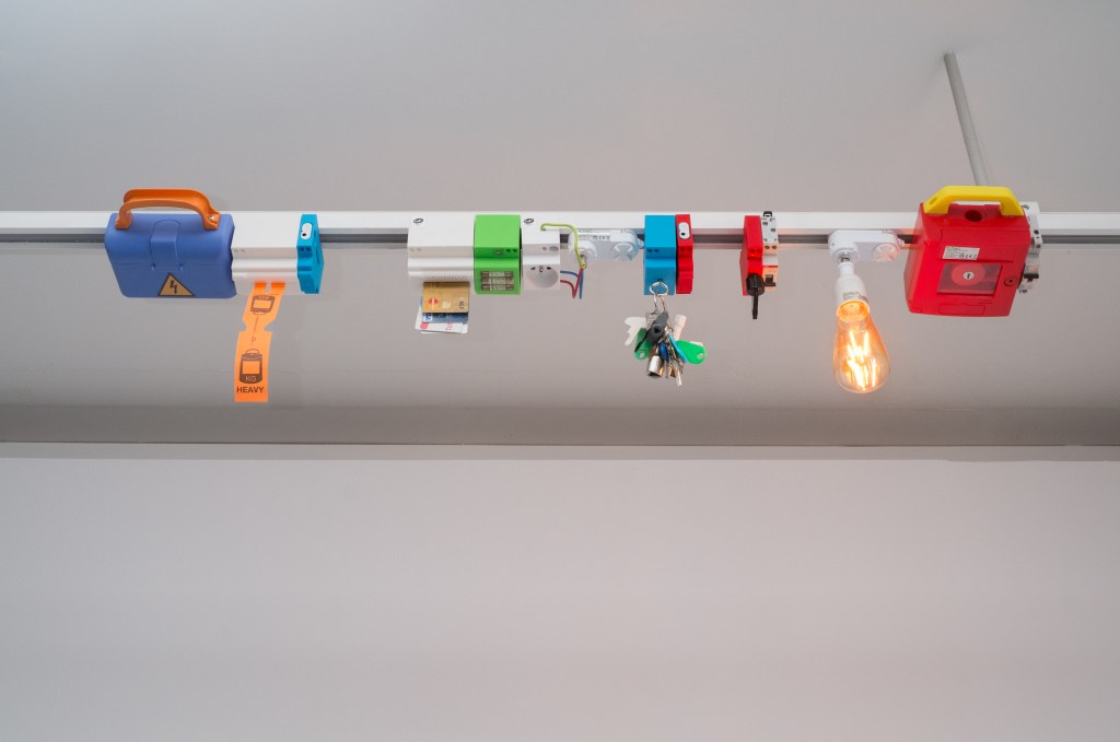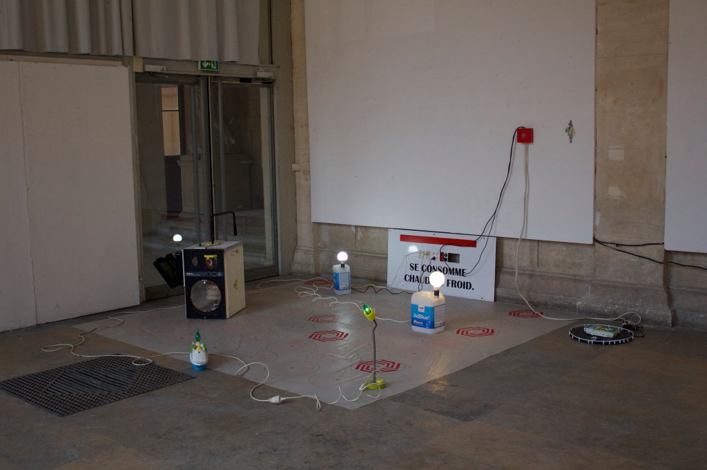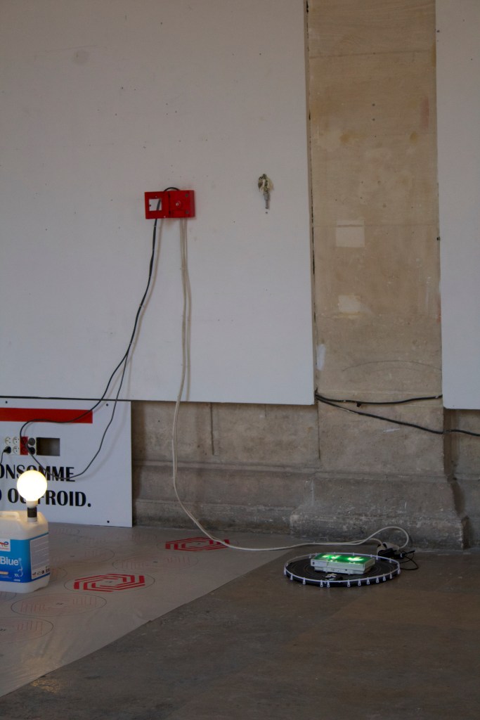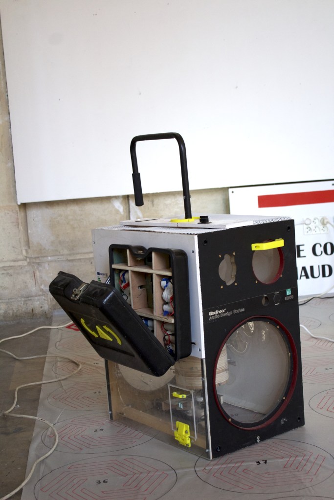 Dans mes recherches exposées dans cette exposition j’ai fabriqué mes propres instruments sculpturaux dans le but de performer des musiques avec. Ces instruments s’inspirent directement des outils techniques de mesure, de stockage et de sécurité qui sont liées à la production et à l’installation électrique. En revanche, mes pièces à la différence de mes compositions musicales aussi présentes dans l’espace, ne sont pas une critique à proprement parler, mais plutôt des présents alternatifs, dans lesquels les technologies auraient pris des esthétiques différentes, des retro-esthétiques bricolées.
