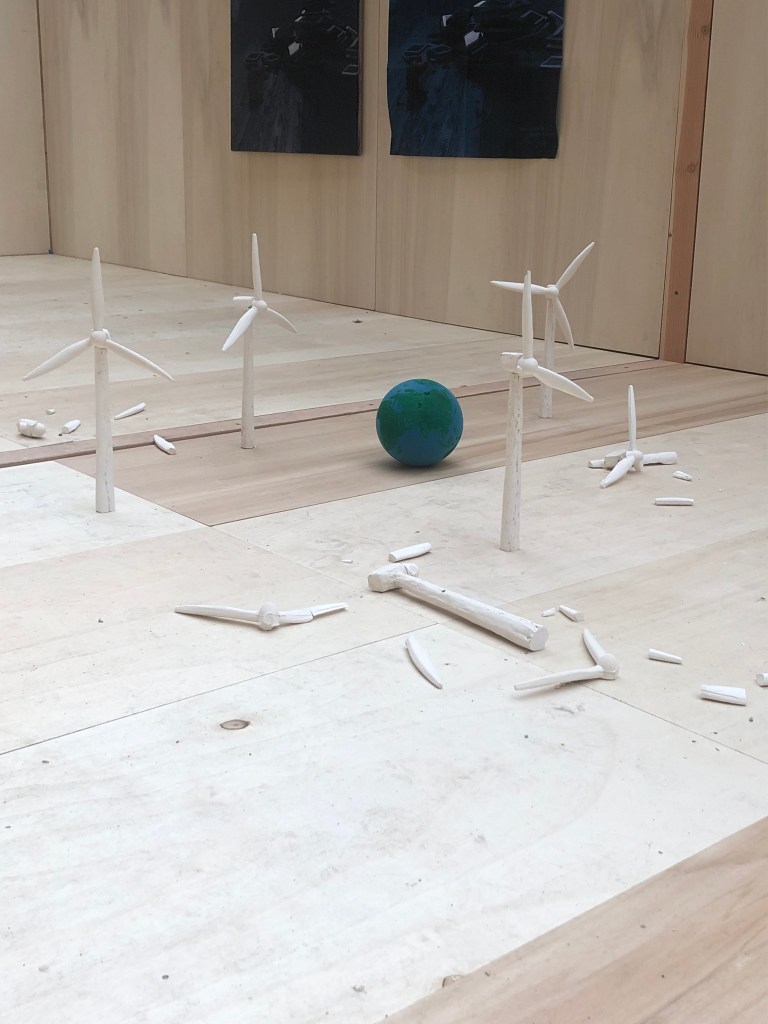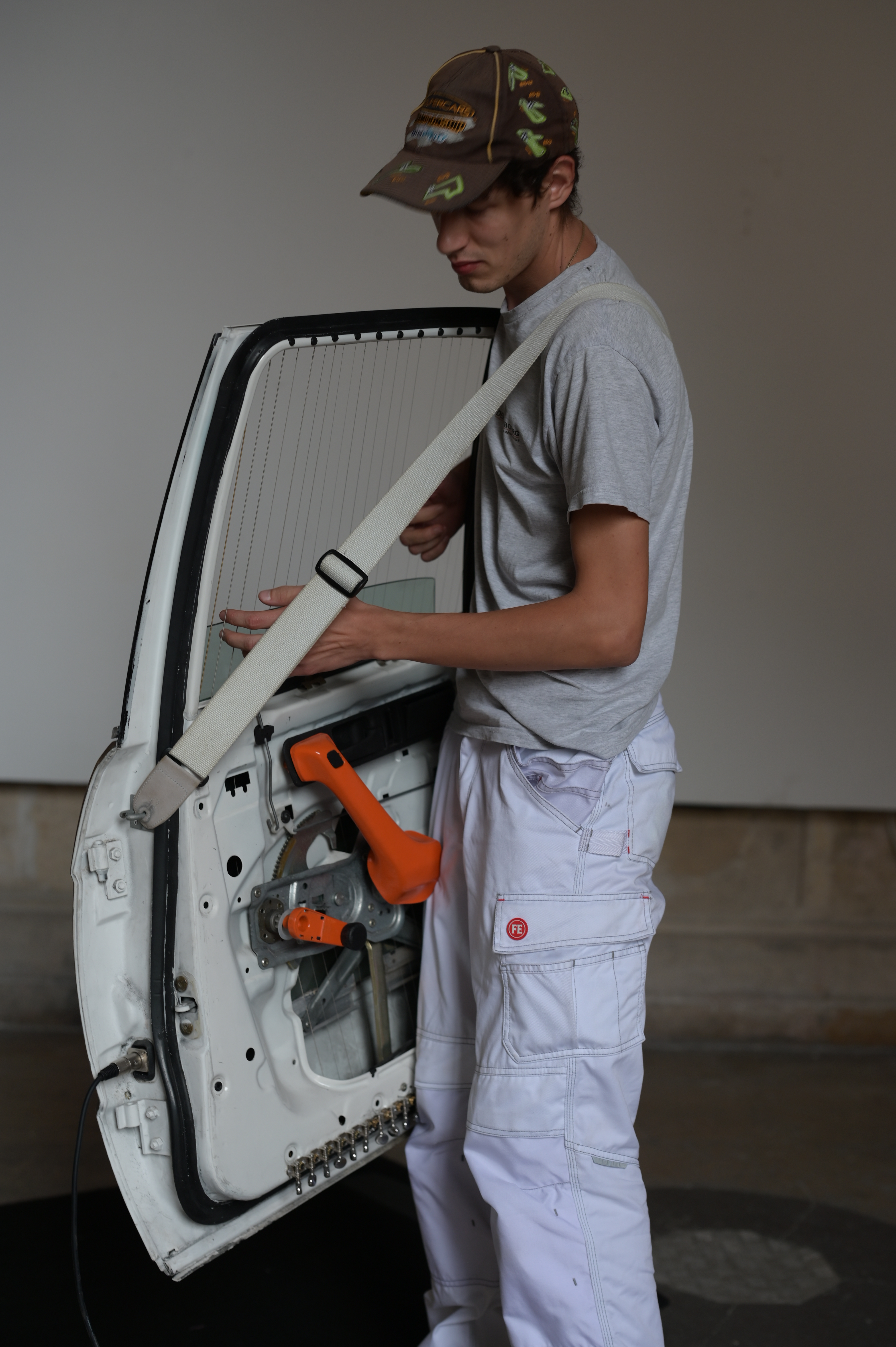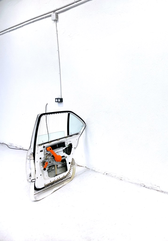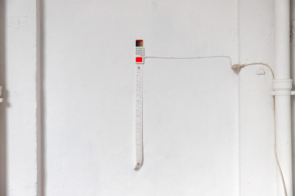 Dans mes recherches exposées dans cette exposition j’ai fabriqué mes propres instruments sculpturaux dans le but de performer des musiques avec. Ces instruments s’inspirent directement des outils techniques de mesure, de stockage et de sécurité qui sont liées à la production et à l’installation électrique. En revanche, mes pièces à la différence de mes compositions musicales aussi présentes dans l’espace, ne sont pas une critique à proprement parler, mais plutôt des présents alternatifs, dans lesquels les technologies auraient pris des esthétiques différentes, des retro-esthétiques bricolées.