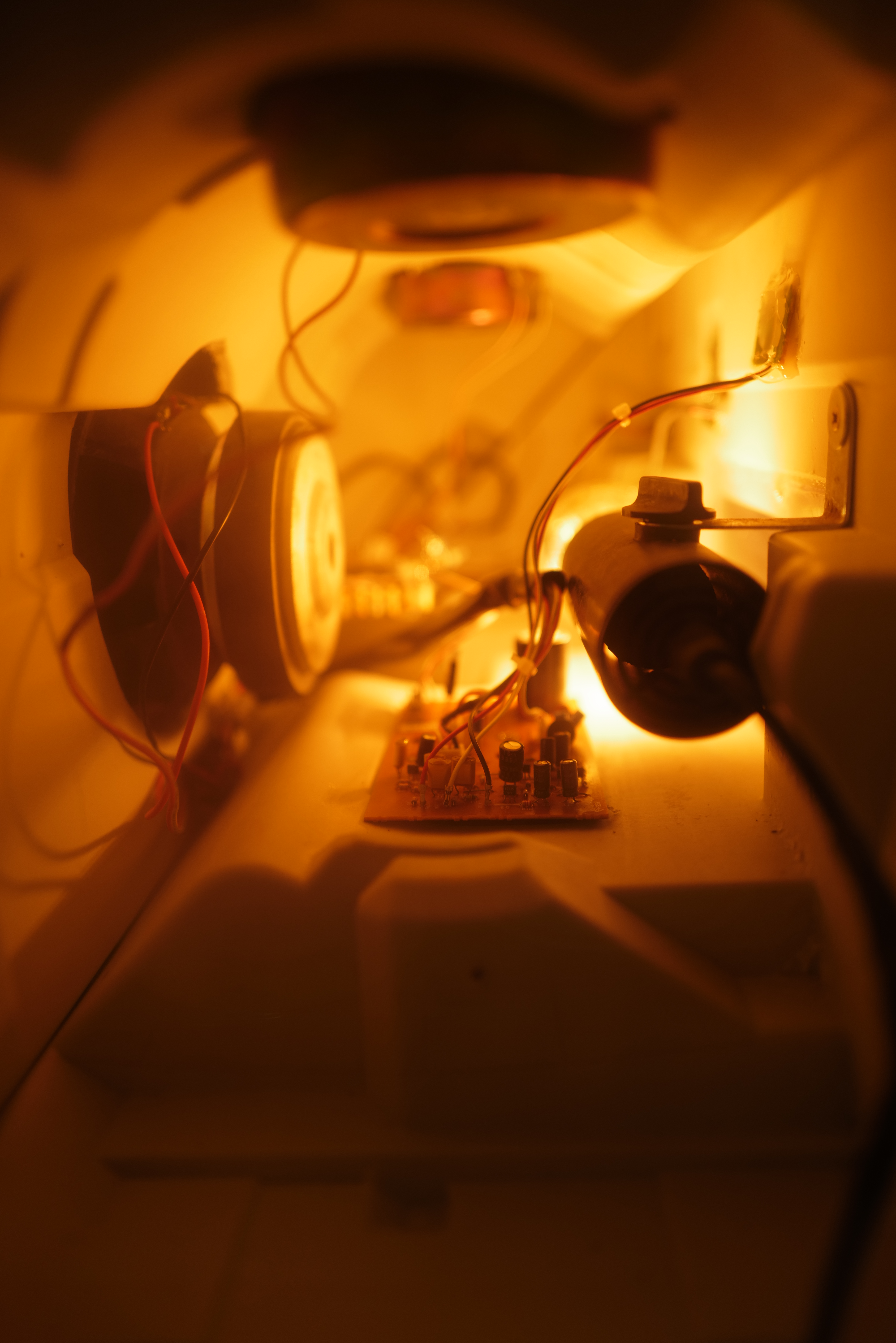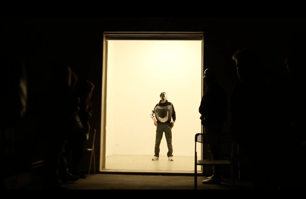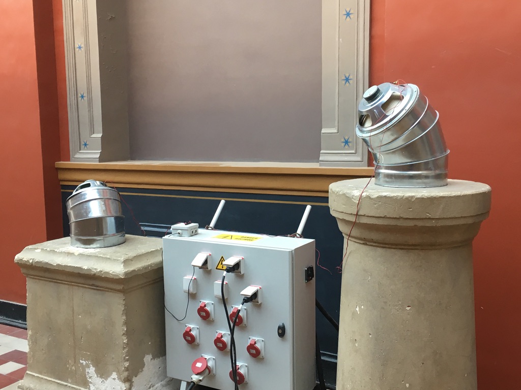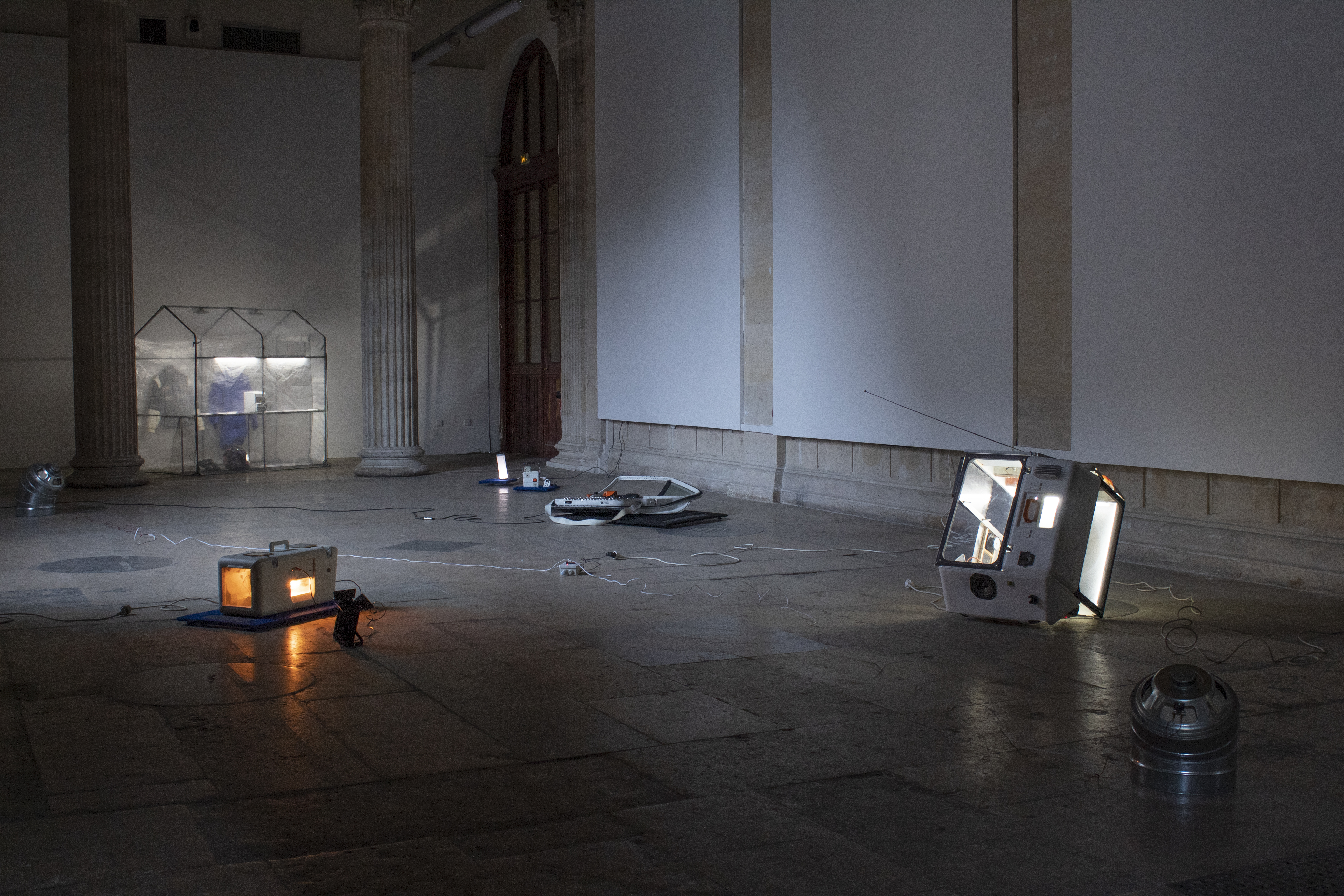 Une invitation à explorer le lieu, où les pièces disséminées auraient pu provenir d’un vaisseau spatial, mais Pierlouis Clavel préfère parler d’ « instruments de musique, de mesure ». Cet étudiant aux Beaux-arts de Paris, nous convie le temps d’une performance pour son diplôme de troisième année à un voyage au bout de la ligne électrique.