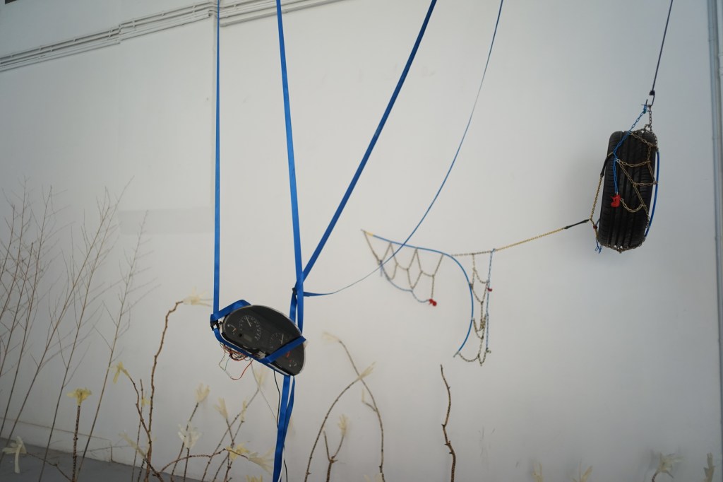 C’est dans cet espace qui rappelle l’ambiance et inspire la vision d’un paysage lunaire que le visiteur avance à tâtons, suivant des fils guidant vers ces œuvres éparpillées de part et d’autre, à la façon d’une explosion suite à crash.