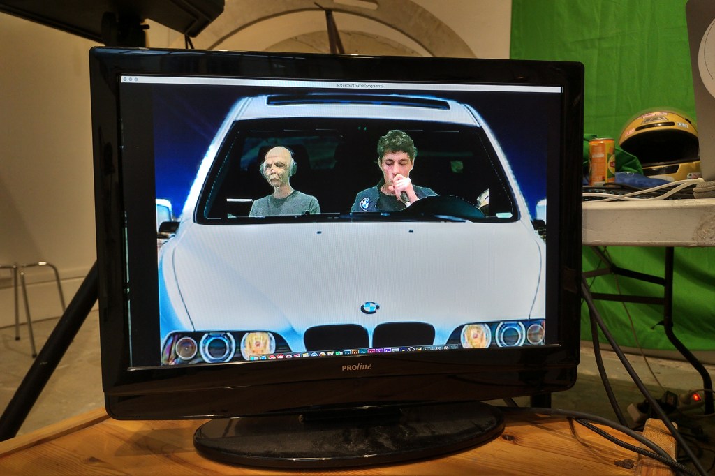 Plus loin, dans la cour, les visiteurs se trouvent médusés devant deux écrans télé derrière lesquels Pierlouis Clavel et Élise effectuent une performance derrière des grilles sur fond vert.